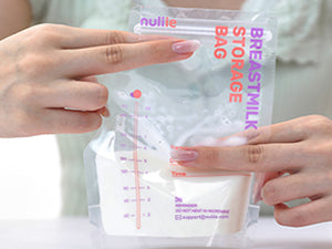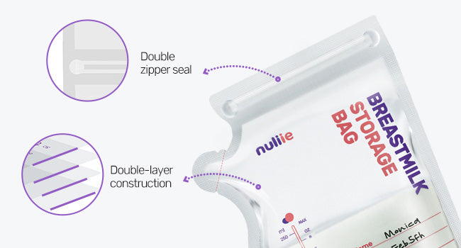 Nuliie Breastmilk Storage Bags feature a side spout, leak-proof seals, BPA-free materials, and labels.